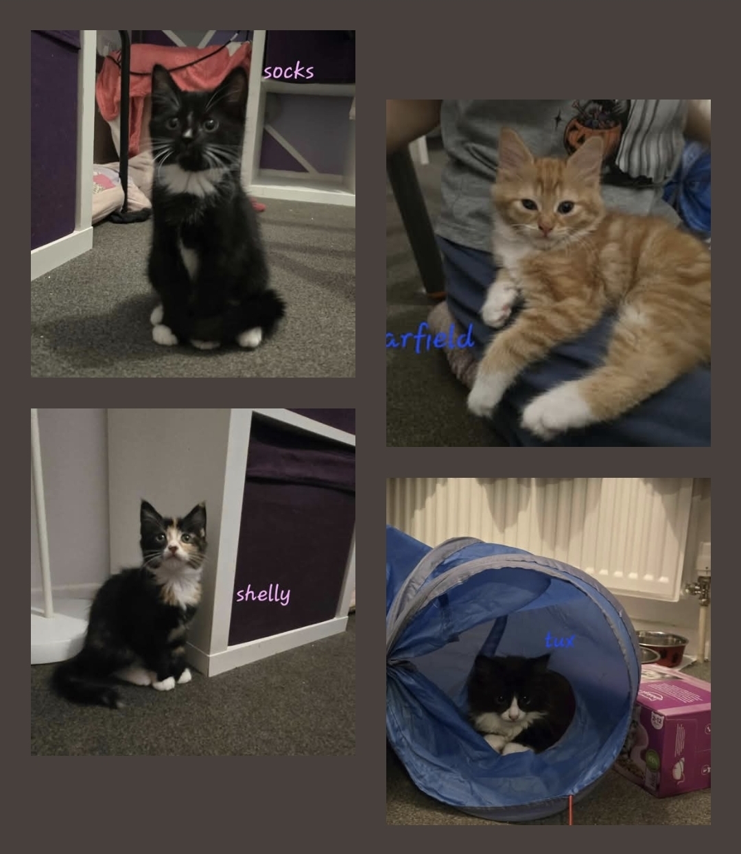 We have the gorgeous Socks and Shelly, a female pair, then Garfield and Tux the boys, looking for their forever homes.