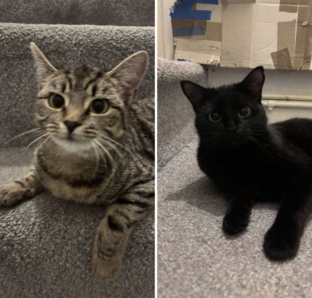 Both follow you around looking for fuss and treats, Kiki is happy to be picked up and fussed, whereas Pebbles LOVES all the fusses she can possibly get, and loves the attack your feet when you're walking and playing. They're both clean with the litter tray, eat well, are fine with other cats, and would be fine to live with older gentle children.