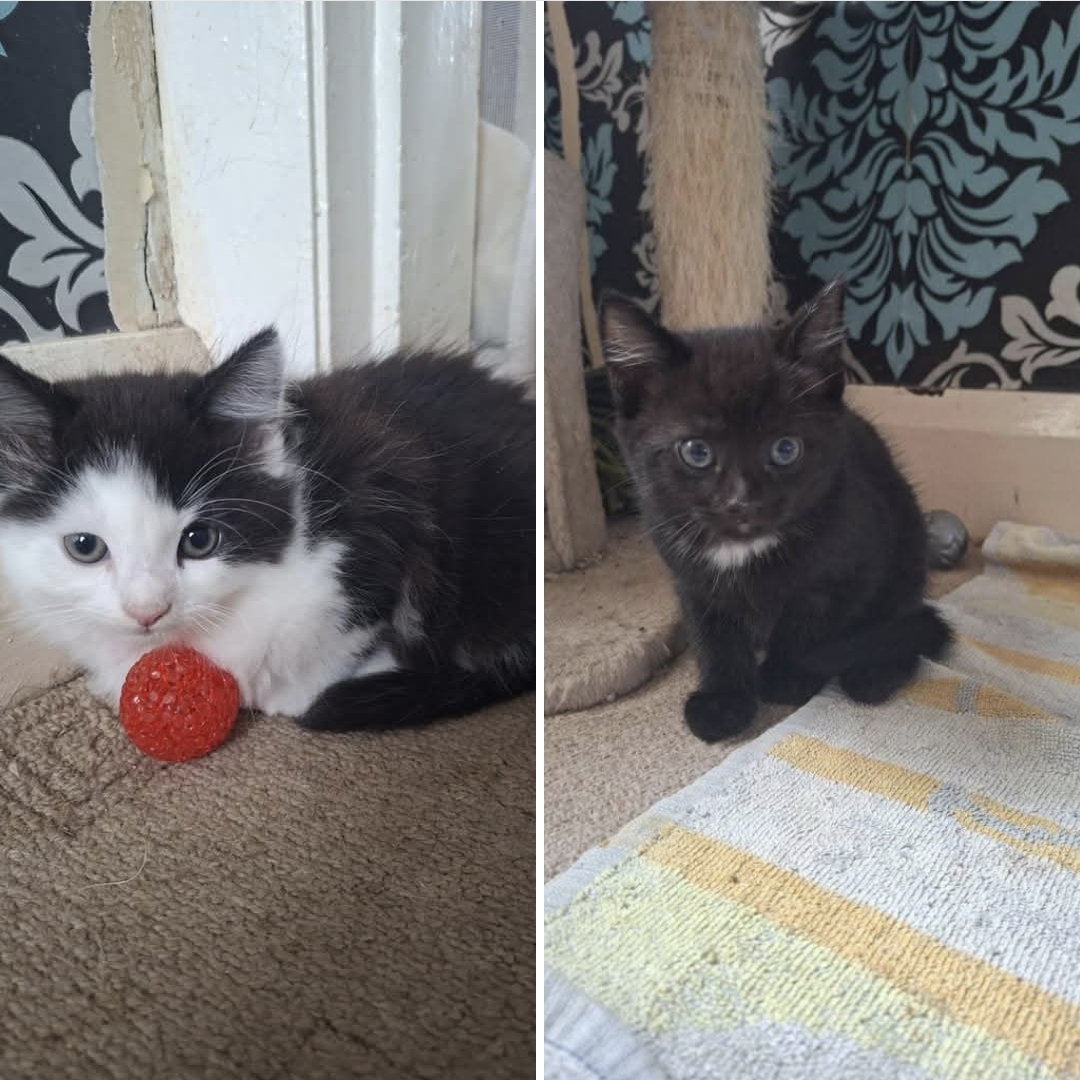 These boys are around 11 weeks old, and were found dumped in a suitcase at a bus stop. They were fairly feral little ones but their foster has worked super hard to get them up to friendly little babies, they're still a little timid so we would rather they went to homes without young children so they find it easier to settle in to their new home.